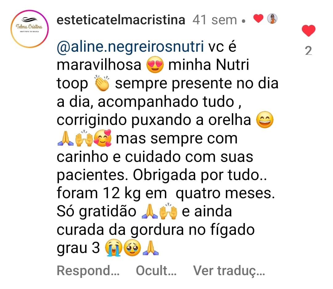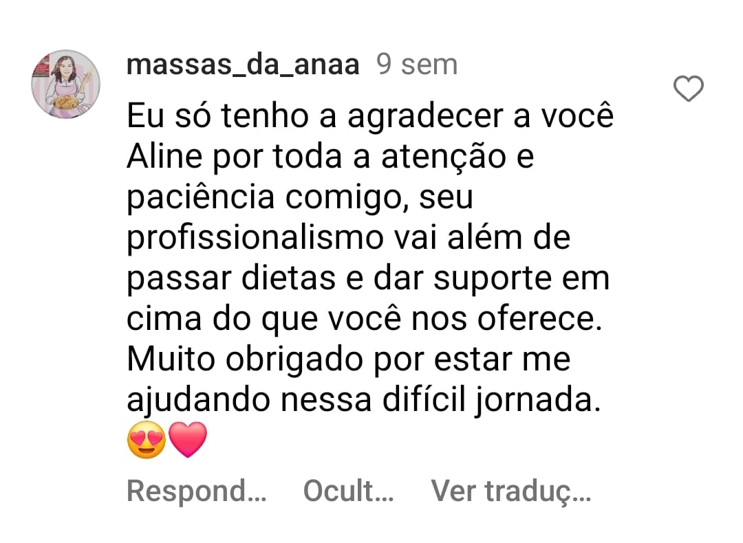 Olá!! Sou Aline Negreiros, nutricionista com quase 2 décadas de profissão. Pós graduada em Nutrição Clínica, Funcional, Ortomolecular e Fitoterapia. Aqui tratamos a raiz do problema e não sintomas, através da Nutrição que eu acredito: simples, pratica e com comida de verdade. Associando junto ao seu tratamento nutricional meios naturais para potencializar os resultados. Por isso resolvi estudar também Naturopatia, Aromaterapia e Fitoterapia.